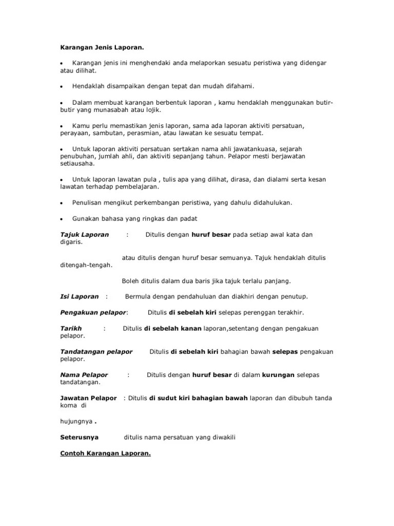 Semoga contoh karangan ini dapat membantu murid. You have just read the article entitled karangan jenis laporan pt3. Andaikan bahawa anda setiausaha sesuatu persatuan di sekolah anda. Sekolah anda baru sahaja selesai mengadakan lawatan ke pusat reakreasi di daerah anda. Contoh karangan laporan pt3 lawatan sambil belajar. Karangan jenis laporan ==================== apa punca pelajar kurang minat untuk menjawab soalan jenis ini? Format karangan laporan bm thn 5 6 . *bagi karangan berformat seperti ini, tajuk dianggap pendahuluan, manakala tandatangan, nama pelapor, dan jawatan dianggap penutup.